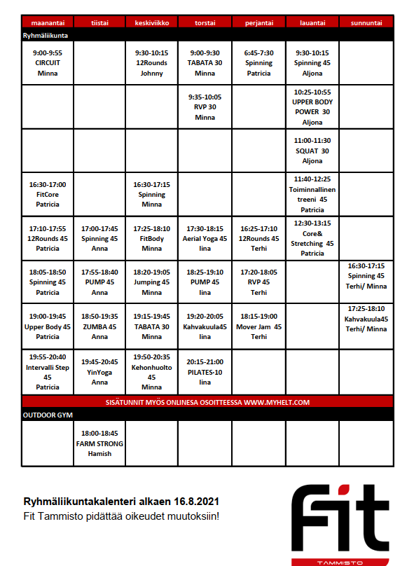 Fit Tammiston ryhmäliikuntakalenteri 16.8.2021 alkaen