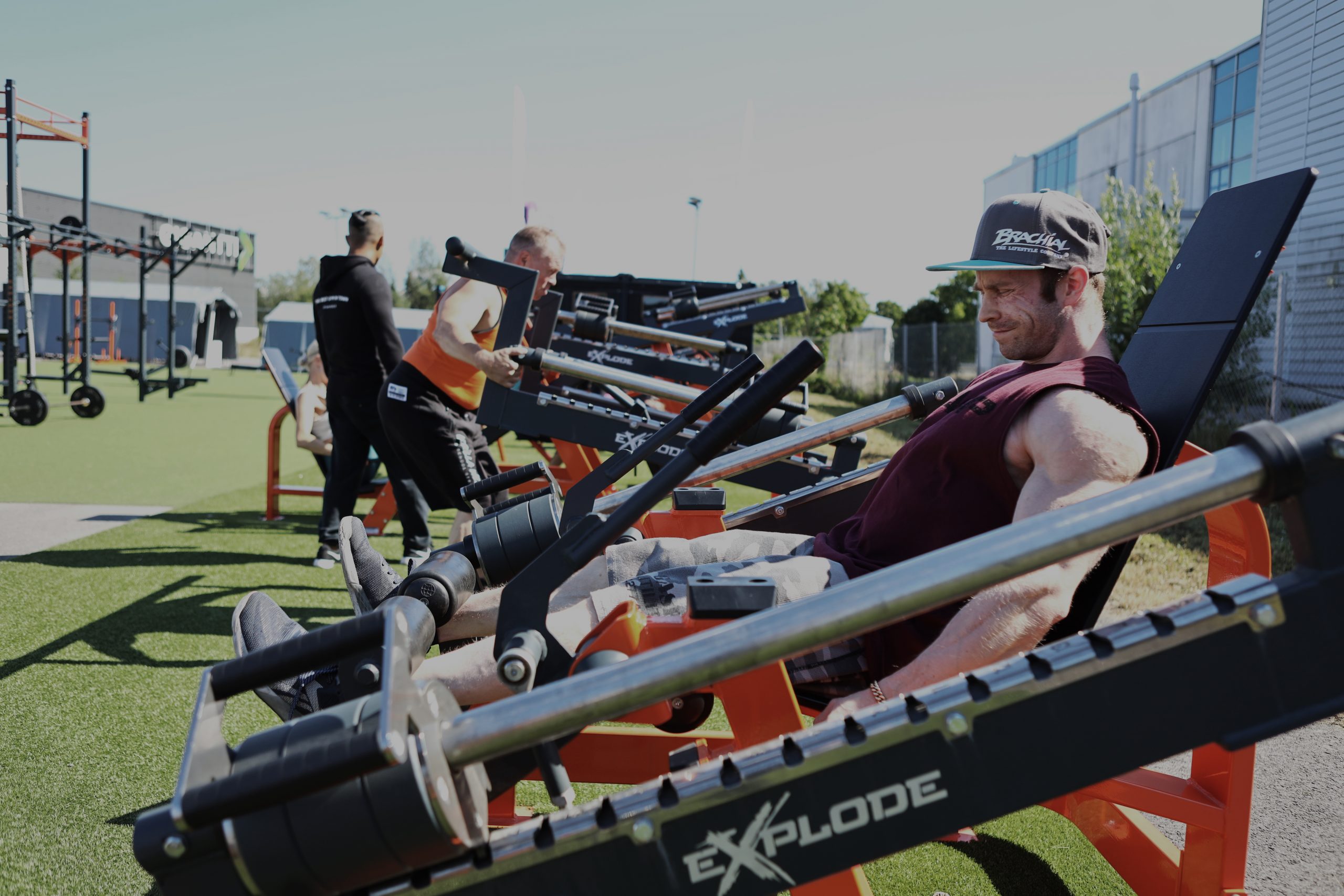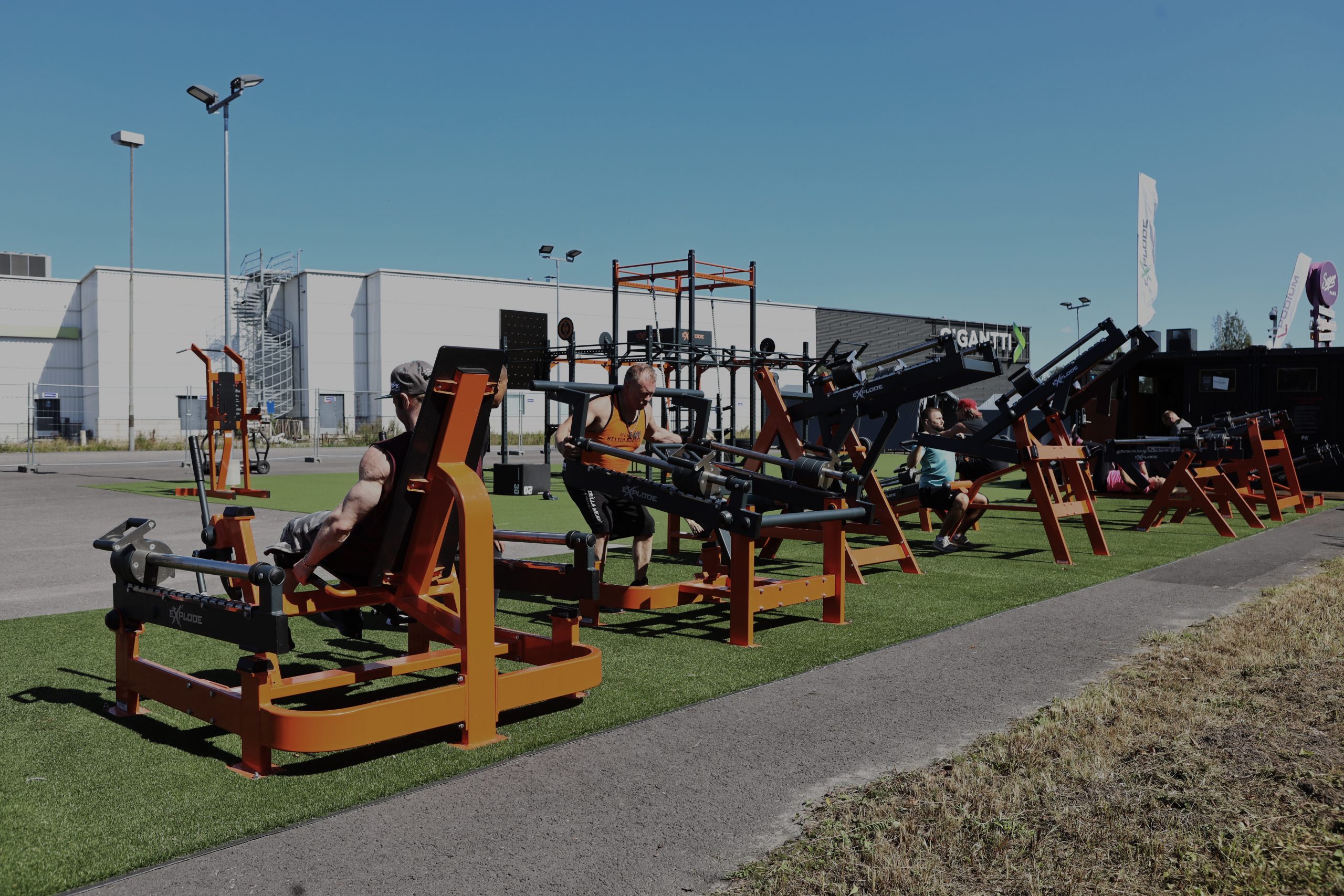 Alueella on valtava toiminnallinen teline, konteista tehty rakennus ja 11 erilaista ulkokäyttöön suunniteltua kuntosalilaitetta